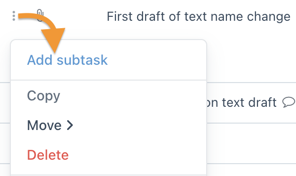 To quickly add a subtask (child task) indented under any existing task, click the 3 vertical dots to the left of the row under which you want the new task to nested. Click Add subtask and enter the task name and task details on the indented row that appears.