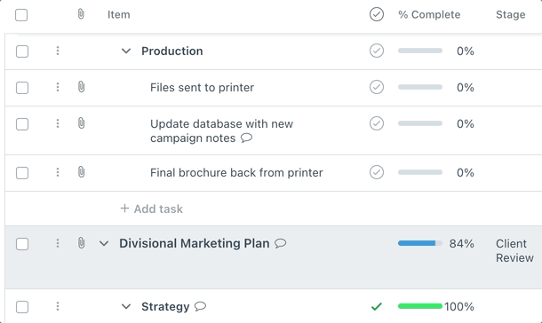 To quickly add a new task, click the "Add task" row that appears at the bottom of each project. You can then enter the name and other details for the new task in each respective column.