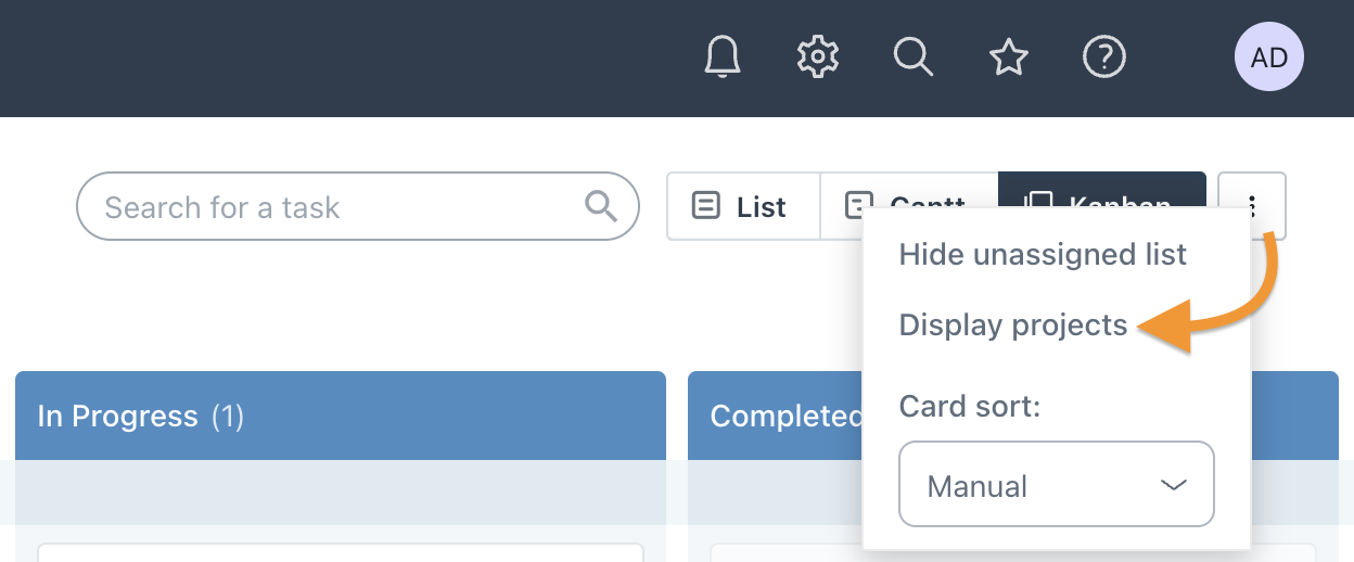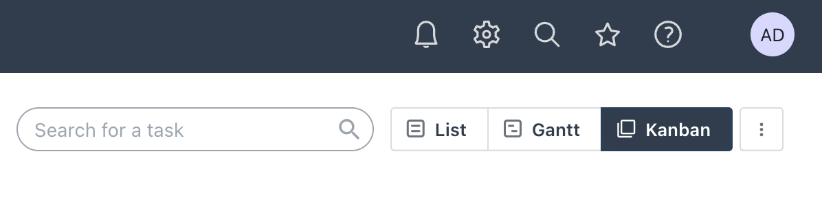 To access the Kanban view of Projects, from the main Projects area, select the Kanban button found near the top right corner of the main view, just to the right of the List and Gantt views, as shown here: