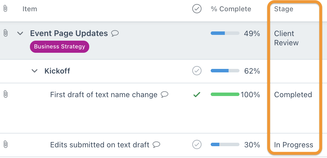 To use stages in other Projects views like List or Gantt, enable the Stage column to show, following the steps to Hide/Display columns. Bulk assigning stages to tasks is also possible using the steps to Edit Multiple Tasks At Once.
