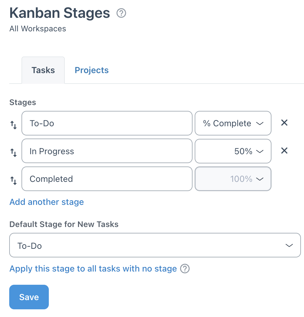 Select either the Tasks or Projects tabs at the top of the page to configure the stages for the appropriate items. Click Add another stage to enter a name for a new stage. Use the "X" icon on the right to remove a stage and click in the field for the stage's name to change the name. To reorder existing stages, drag and drop the double arrow icon to the left of each stage. For task stages, a % Complete value can be applied to each stage. This % Complete value will be applied to each ask whenever a task is moved into that stage.